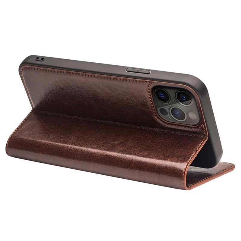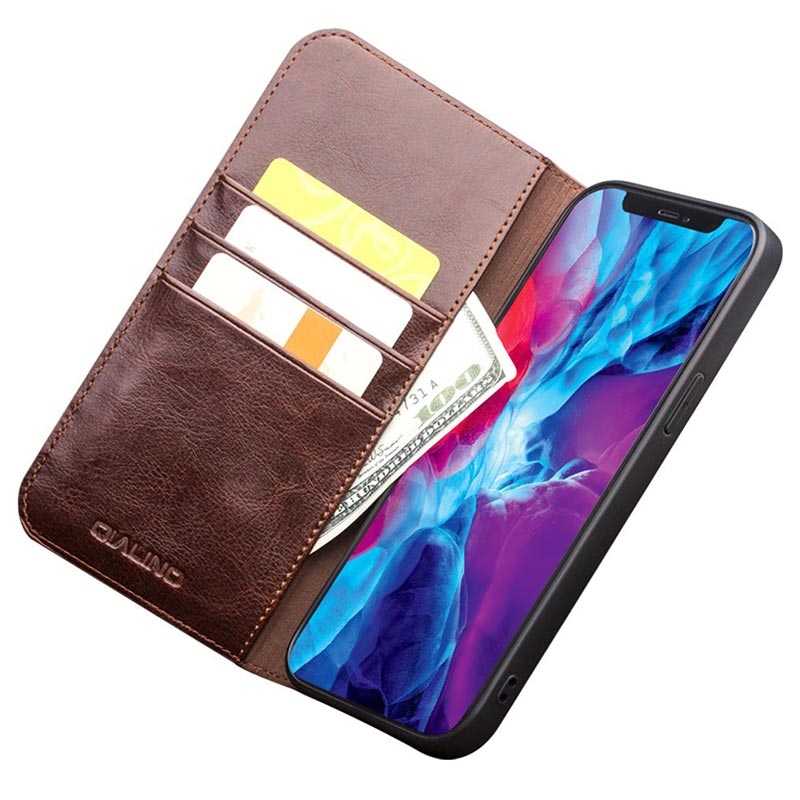 - Hoge kwaliteit koeienhuid iPhone 13 Pro portemonnee hoesje van Qialino