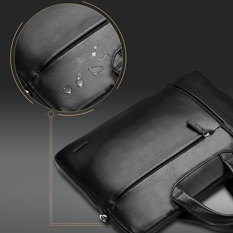 Geef je notebook een eersteklas behandeling met deze Qialino laptoptas, gemaakt van top-grain rundleer dat bestand is tegen alledaagse spetters en er moeiteloos professioneel uitziet. De zachte voering van fleece en parelkatoen beschermt apparaten tot 13 inch en met de afneembare schouderriem kun je in een paar seconden wisselen tussen een aktetas en een cross-body tas. Meerdere binnenvakken houden telefoon, powerbank en notebook netjes georganiseerd voor gestroomlijnd reizen.