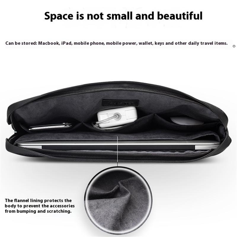 Eén aankoop biedt drievoudige bescherming - water-, schok- en krasbestendigheid - en vervangt de dunne neopreen hoezen die elk jaar vervangen moeten worden. Het hoogwaardige nano-textiel blijft langer elegant en dankzij het afneembare handvat hoef je geen aparte aktetas te kopen voor korte trips.