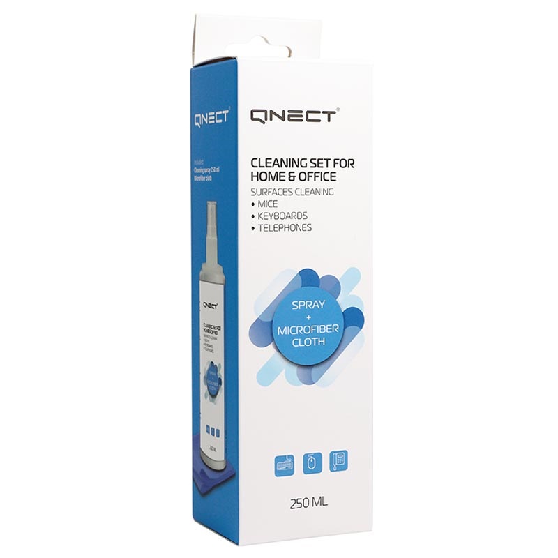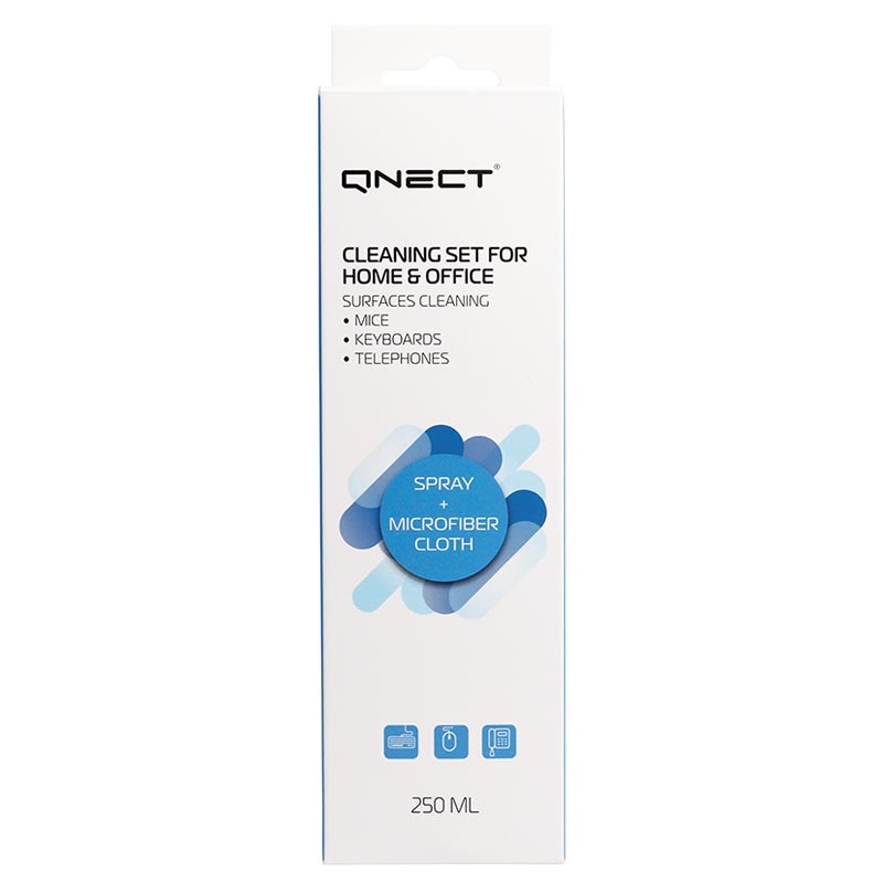 Zelfs als je thuis of op kantoor werkt, moet je jouw bureau, toetsenbord, muis en andere plastic onderdelen desinfecteren om zo onnodig risico te vermeiden en gezond te blijven. De Qnect antibacteriële reinigingsset bevat 250 ml desinfectiespray en microvezeldoek.