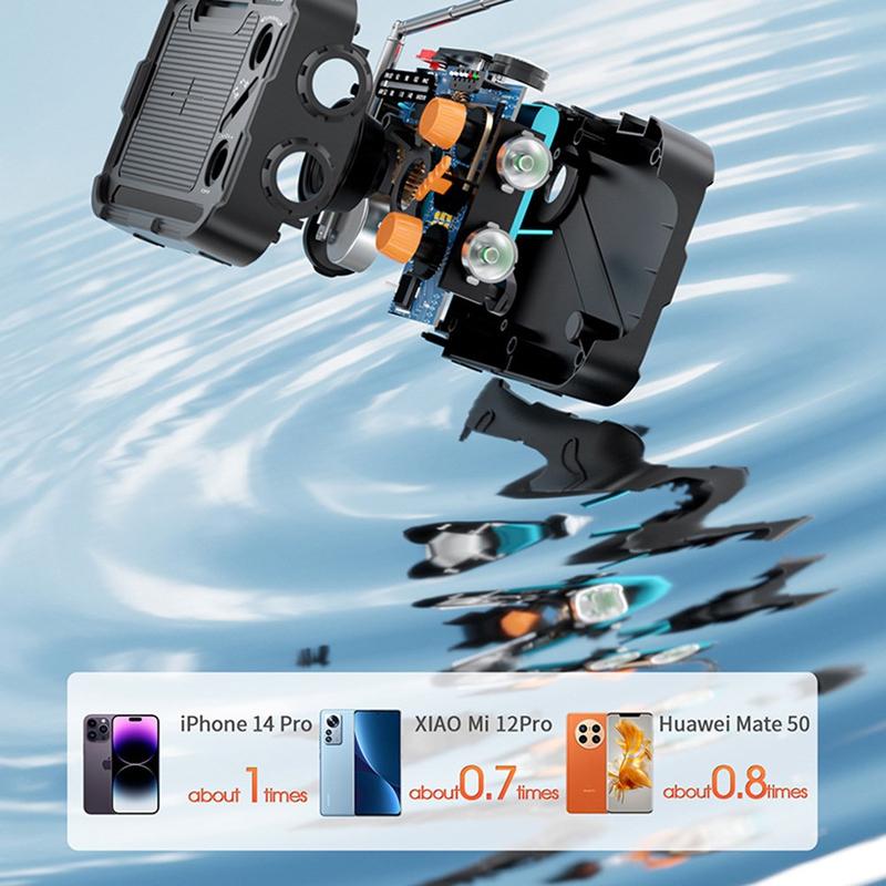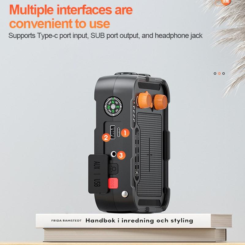 - Ingang: Zonne-opladen (5.5V/40mA), Type-C (5V/2A), Hand Crank (5V/400mA)