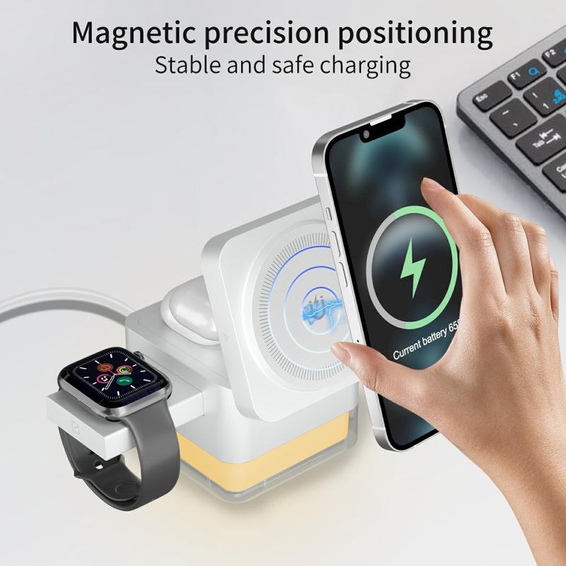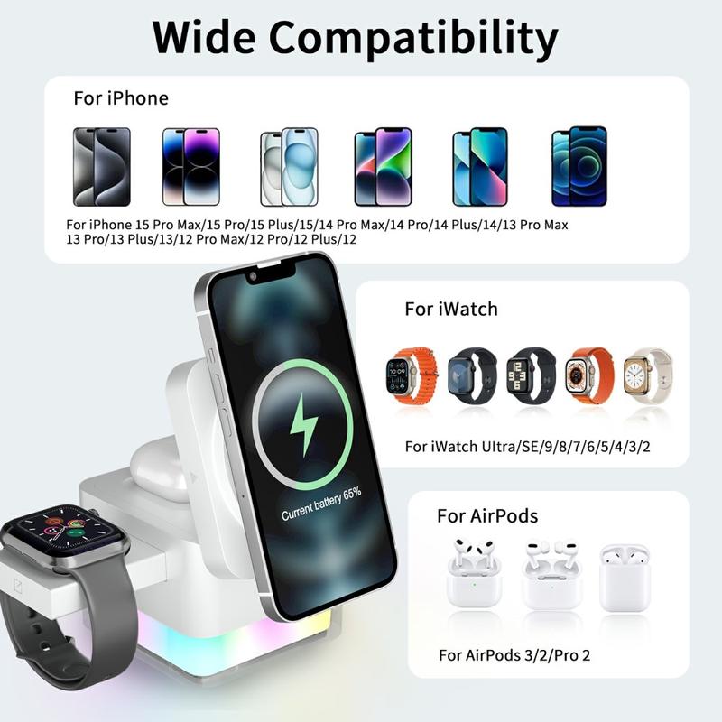 Dankzij de magnetische uitlijning blijven compatibele apparaten in de juiste positie voor stabiel opladen, terwijl het opvouwbare ontwerp ervoor zorgt dat het dock gemakkelijk in een tas of rugzak past. Het beschikt ook over RGB-sfeerverlichting die een zachte decoratieve gloed toevoegt en kan dienen als zacht nachtlampje op een bureau of nachtkastje.