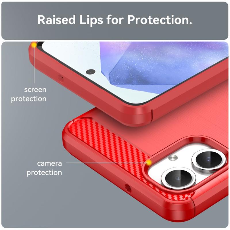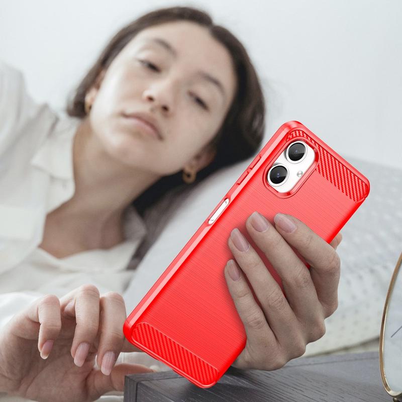 Het hoesje van geborsteld TPU beschermt je Samsung Galaxy A06 voldoende en geeft het een geweldige stijl, dankzij het koolstofvezelpatroon op de achterkant. De case zorgt ook voor oververhitting bij gebruik van je Samsung Galaxy A06, met zijn ontwerp voor warmteafvoer.