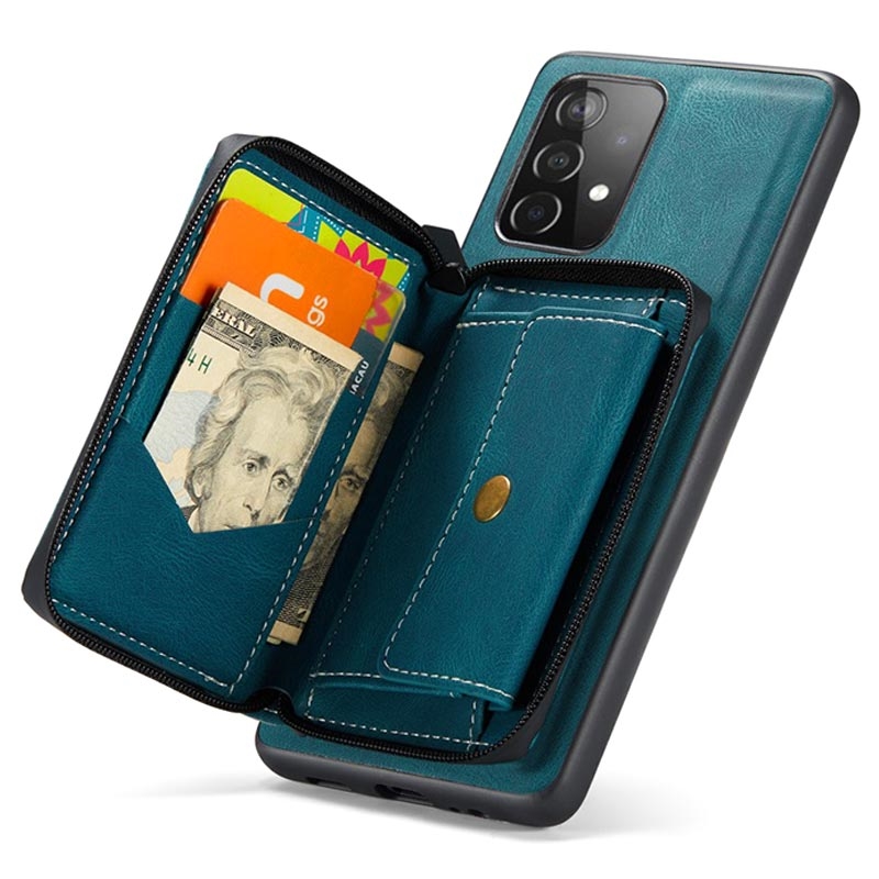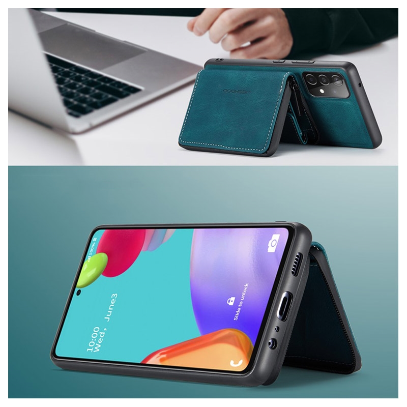 Ervaar de perfecte mix van stijl, gemak en bescherming voor de Samsung Galaxy A52 5G, Galaxy A52 4G, Galaxy A52s 5G met de Jeehood afneembare hoes met portemonnee. Deze stijlvolle hoes heeft een twee-in-een ontwerp met een afneembare portemonnee, stevig bij elkaar gehouden door sterk magnetisme. De portemonnee heeft drie kaartsleuven en twee geldvakken die zijn voorzien van een ritssluiting, zodat alles binnenin veilig blijft. Het is gemaakt van een mix van TPU en eersteklas PU-leer en zorgt voor uitstekende bescherming tegen vallen.