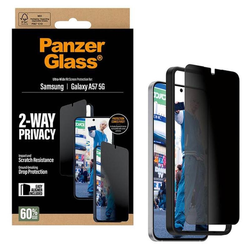 - PanzerGlass Ultra-Wide Fit Privacy EasyAligner Screen Protector is NIET compatibel met de vingerafdruksensor van de Samsung Galaxy A57