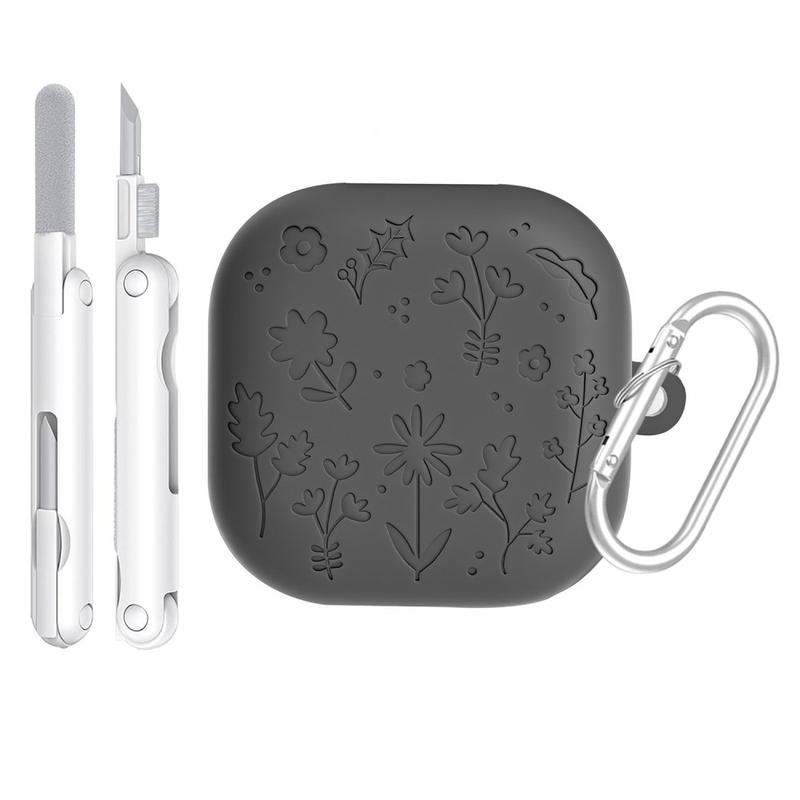 Samsung Galaxy Buds4/Buds4 Pro siliconen hoesje met bloemenmotief en reinigingspennen - donkergrijs