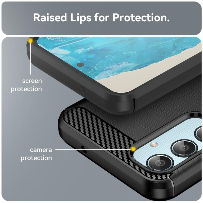 Het hoesje van geborsteld TPU beschermt je Samsung Galaxy M35 voldoende en geeft het een geweldige stijl, dankzij het koolstofvezelpatroon op de achterkant. De case zorgt ook voor oververhitting bij gebruik van je Samsung Galaxy M35, met zijn ontwerp voor warmteafvoer.