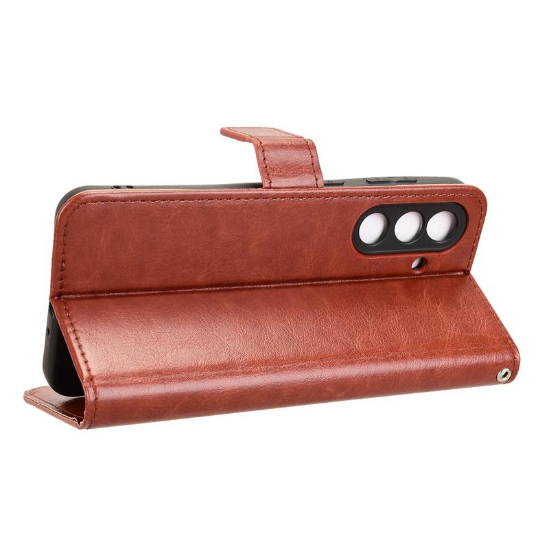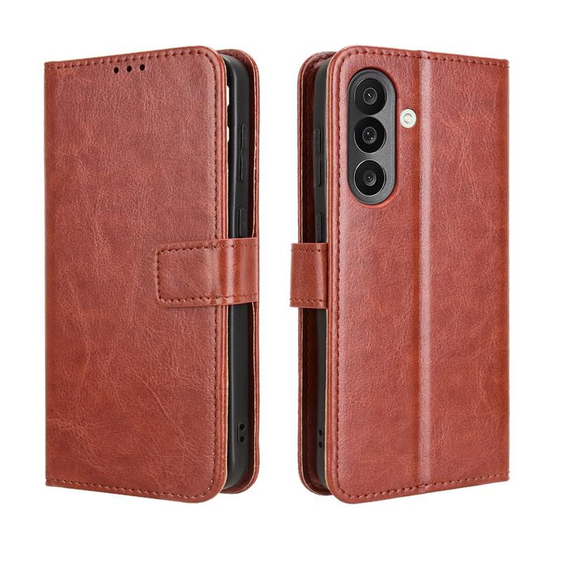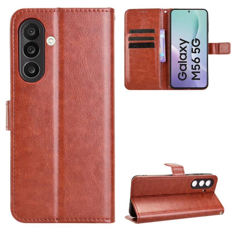 Geef je nieuwe Samsung Galaxy M56 een verfijnde, vintage look en vervang je alledaagse portemonnee. De buitenkant van polyurethaan met Crazy Horse-textuur wordt gecombineerd met een schokabsorberend TPU-omhulsel dat bescherming biedt tegen vallen en krassen, terwijl slimme vakjes pasjes en geld op orde houden.