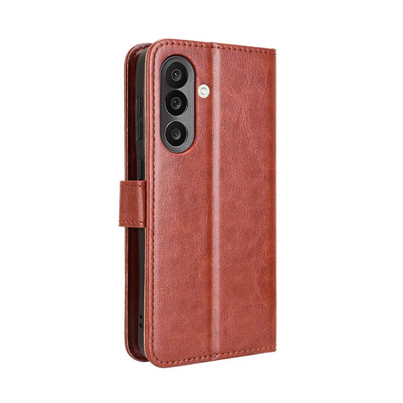 Geef je nieuwe Samsung Galaxy M56 een verfijnde, vintage look en vervang je alledaagse portemonnee. De buitenkant van polyurethaan met Crazy Horse-textuur wordt gecombineerd met een schokabsorberend TPU-omhulsel dat bescherming biedt tegen vallen en krassen, terwijl slimme vakjes pasjes en geld op orde houden.