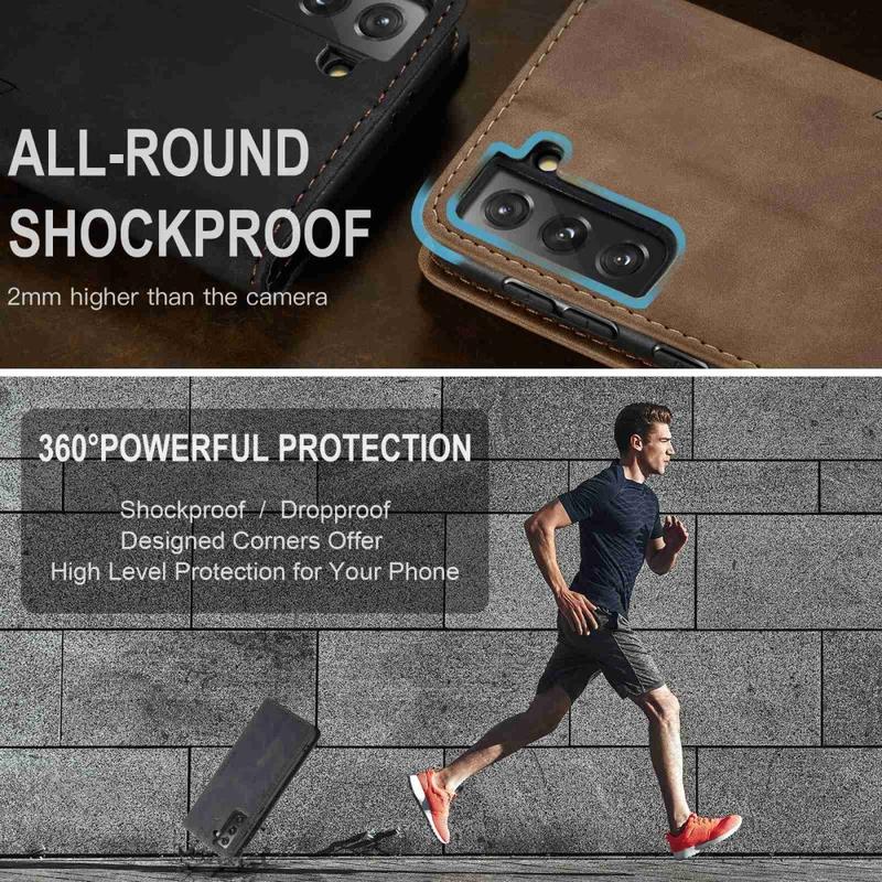 Een combinatie van TPU en polyurethaan biedt volledige bescherming voor Samsung Galaxy S21 5G en beschermt deze tegen stof, vuil, stoten, krassen en dagelijkse slijtage. Magnetische aantrekkingskracht houdt de behuizing gesloten en het slimme ontwerp maakt handsfree gebruik mogelijk tijdens het bekijken van media-inhoud.