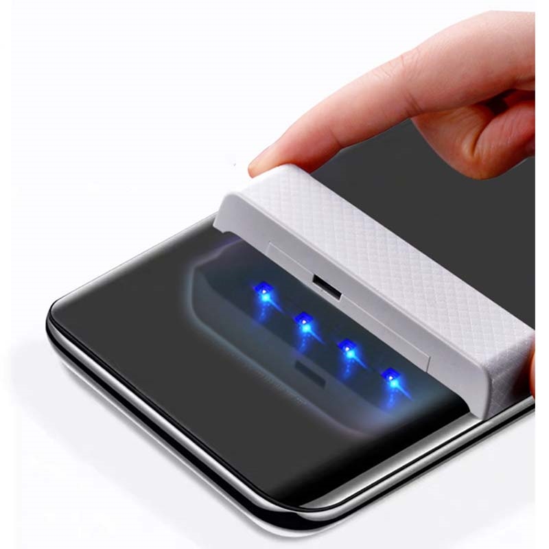- Plaats de schermbeschermer van gehard glas voorzichtig op het scherm van het apparaat en wacht tot de UV-lijm volledig is verspreid zonder naar beneden te drukken