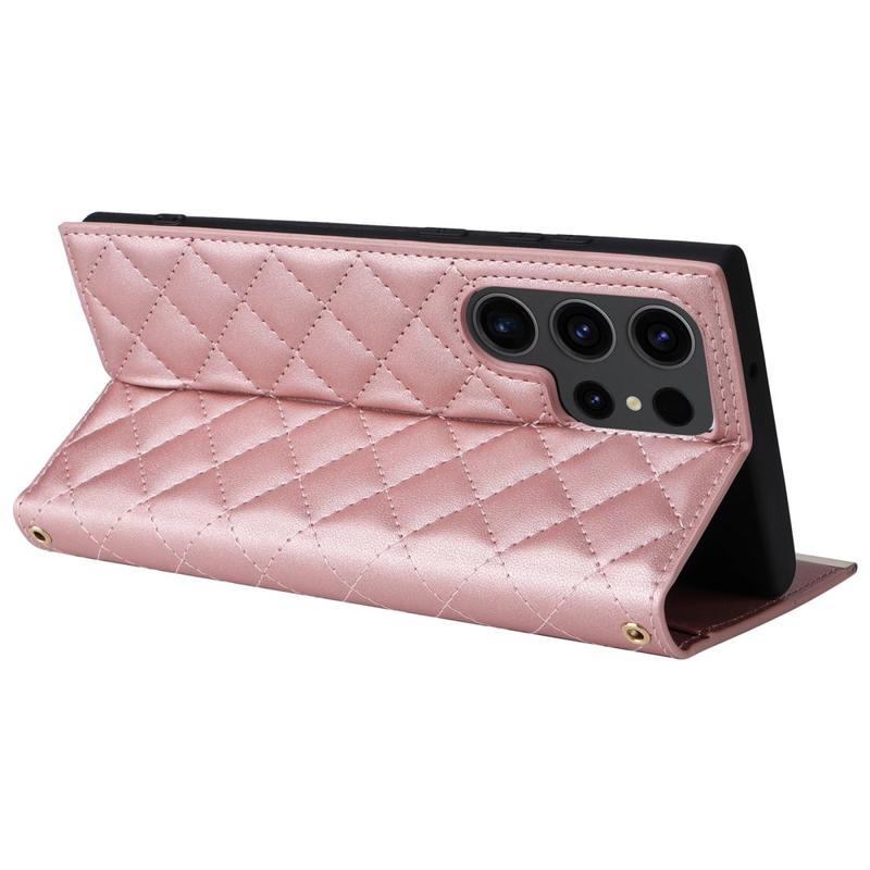 Bescherm je Samsung Galaxy S23 Ultra met deze luxe gewatteerde wallet case. Deze hoes is gemaakt van TPU-materiaal gecoat met PU leer, is krasbestendig en anti-vingerafdruk, zodat je telefoon er stijlvol en strak uit blijft zien. De stiksellijn vormt een ruitvormig rasterpatroon, waardoor de case een modieus en mooi tintje krijgt. De verhoogde rand van de camera en het scherm bieden effectieve bescherming tegen krassen, terwijl de nauwkeurige uitsparingen volledige toegang bieden tot alle knoppen, poorten en andere functies. Dankzij het portemonnee-ontwerp kunnen essentiële pasjes en contant geld gemakkelijk worden opgeborgen en de meegeleverde zuignappen kunnen worden gebruikt als steun voor handsfree gebruik. Met extra bescherming tegen krassen, stoten, vallen en dagelijkse schade wordt deze hoes ook geleverd met een schouderband en polsband voor extra gebruiksgemak.