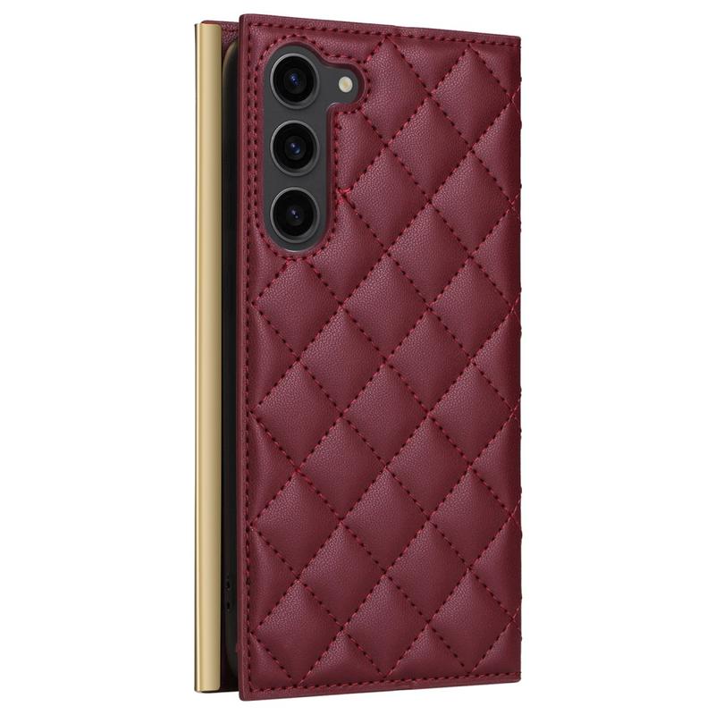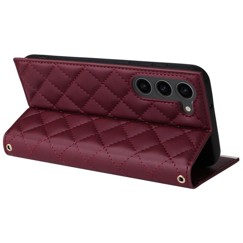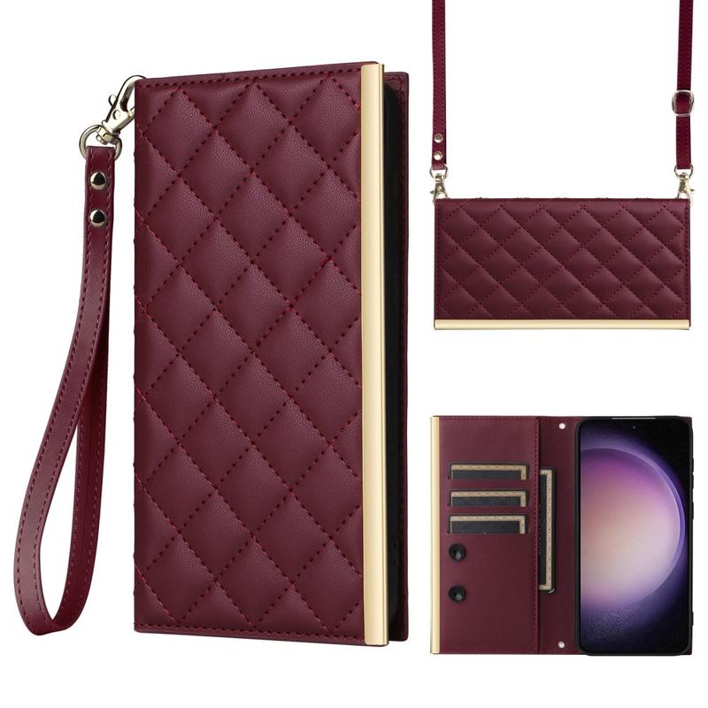 Bescherm je Samsung Galaxy S23 met deze luxe gewatteerde wallet case. Deze hoes is gemaakt van TPU-materiaal gecoat met PU leer, is krasbestendig en anti-vingerafdruk, zodat je telefoon er stijlvol en strak uit blijft zien. De stiksellijn vormt een ruitvormig rasterpatroon, waardoor de case een modieus en mooi tintje krijgt. De verhoogde rand van de camera en het scherm bieden effectieve bescherming tegen krassen, terwijl de nauwkeurige uitsparingen volledige toegang bieden tot alle knoppen, poorten en andere functies. Dankzij het portemonnee-ontwerp kunnen essentiële pasjes en contant geld gemakkelijk worden opgeborgen en de meegeleverde zuignappen kunnen worden gebruikt als steun voor handsfree gebruik. Met extra bescherming tegen krassen, stoten, vallen en dagelijkse schade wordt deze hoes ook geleverd met een schouderband en polsband voor extra gebruiksgemak.