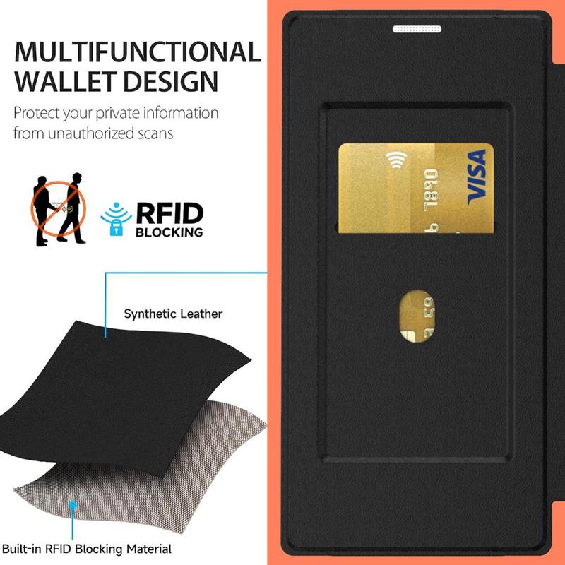 Dit premium Samsung Galaxy S24 Ultra hoesje is gemaakt van TPU, acryl en polyurethaan van hoge kwaliteit, met behulp van een fijn proces om een delicate en verfijnde afwerking te garanderen. Het is uitgerust met een handige kaartsleuf om onderweg eenvoudig te kunnen pinnen en uitgeven, en is voorzien van een sterke magneet voor automatisch sluiten, waardoor het veilig en handig is om items in het hoesje te bewaren. Dit Samsung Galaxy S24 Ultra hoesje biedt effectieve bescherming tegen dagelijkse slijtage, krassen, vlekken en schrammen, terwijl de geavanceerde RFID-blokkeringstechnologie in de kaartsleuf ervoor zorgt dat je persoonlijke gegevens beschermd zijn tegen diefstal. Bovendien is de ingebouwde magnetische ring compatibel met MagSafe draadloos opladen, wat betekent dat je je Samsung Galaxy S24 Ultra kunt opladen zonder het hoesje af te doen.