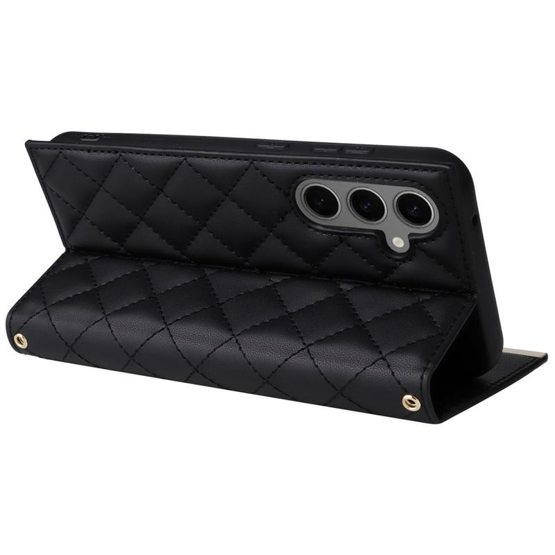 Bescherm je Samsung Galaxy S24+ met deze luxe gewatteerde wallet case. Deze hoes is gemaakt van TPU-materiaal gecoat met PU leer, is krasbestendig en anti-vingerafdruk, zodat je telefoon er stijlvol en strak uit blijft zien. De stiksellijn vormt een ruitvormig rasterpatroon, waardoor de case een modieus en mooi tintje krijgt. De verhoogde rand van de camera en het scherm bieden effectieve bescherming tegen krassen, terwijl de nauwkeurige uitsparingen volledige toegang bieden tot alle knoppen, poorten en andere functies. Dankzij het portemonnee-ontwerp kunnen essentiële pasjes en contant geld gemakkelijk worden opgeborgen en de meegeleverde zuignappen kunnen worden gebruikt als steun voor handsfree gebruik. Met extra bescherming tegen krassen, stoten, vallen en dagelijkse schade wordt deze hoes ook geleverd met een schouderband en polsband voor extra gebruiksgemak.