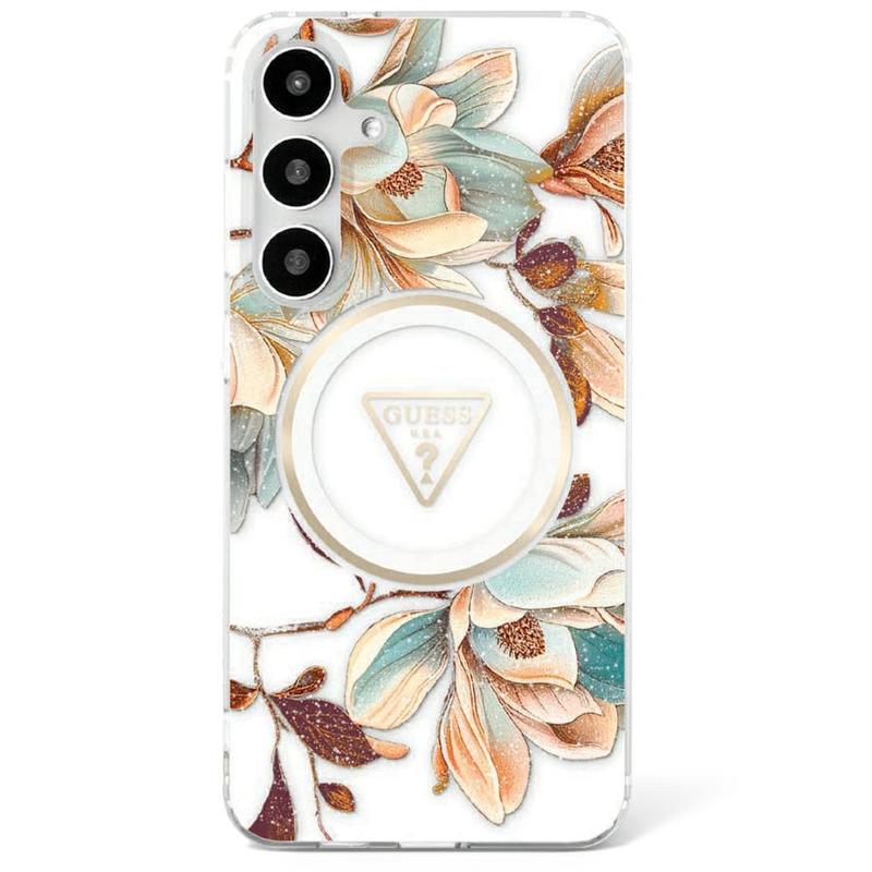 Guess Glitter Flowers Triangle Buttons MagSafe Hoesje voor Samsung Galaxy S25