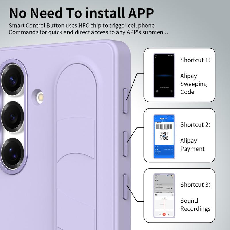 Deze slimme hybride hoes is uitgerust met drie intelligente NFC-knoppen waarmee je met één druk op de knop snel toegang krijgt tot apps als Camera, Zaklamp of Screenshot. Niet opladen, geen extra apps - gewoon eenvoudige, directe functionaliteit.