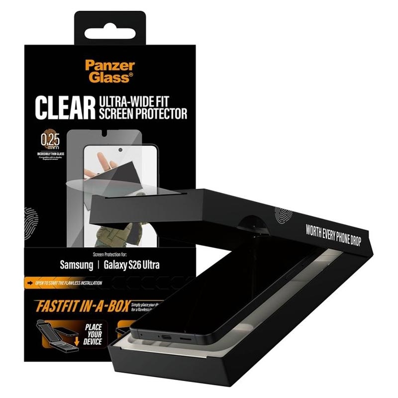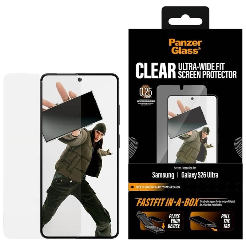 De PanzerGlass Ultra-Wide Fit Screen Protector voor Samsung Galaxy S26 Ultra is ontworpen voor snelle, bubble-free installatie dankzij het innovatieve FASTFIT IN-A-BOX systeem. Plaats je Samsung Galaxy S26 Ultra gewoon met de voorkant naar boven, trek aan het lipje en geniet elke keer van een perfect uitgelijnde protector - geen stof, geen frustratie.