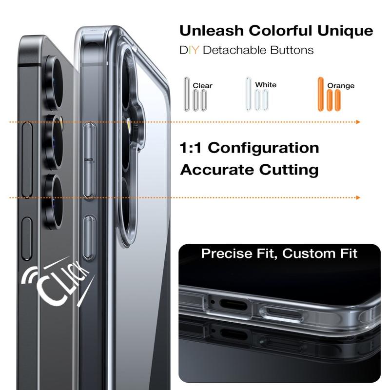 De case bevat drie verwisselbare kleurensets voor knoppen, zodat je het uiterlijk van je Samsung Galaxy S26+ kunt personaliseren. Verwissel eenvoudig knoppen die bij je stijl, outfit of stemming passen en creëer een uniek, aangepast uiterlijk.