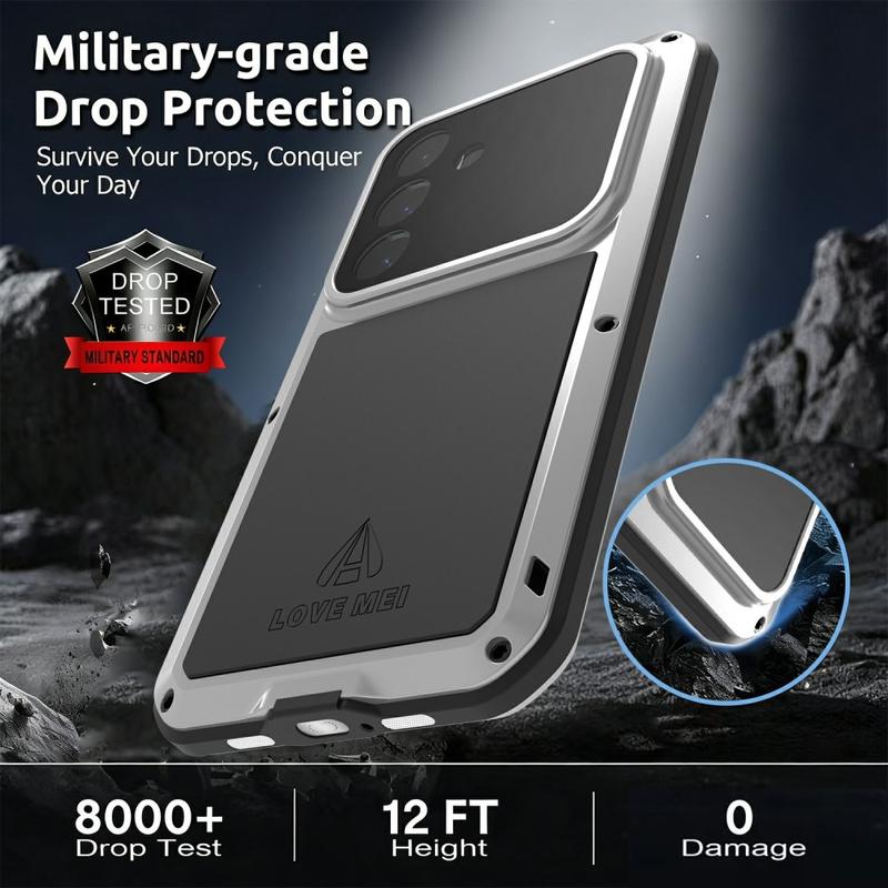 De Love Mei serie is geïnspireerd door militaire en industriële techniek, waarbij gebruik wordt gemaakt van meerlaagse bescherming met metalen frames en siliconen demping - een structuur die bestand is tegen vallen van meer dan 2 meter met behoud van touchscreen gevoeligheid.