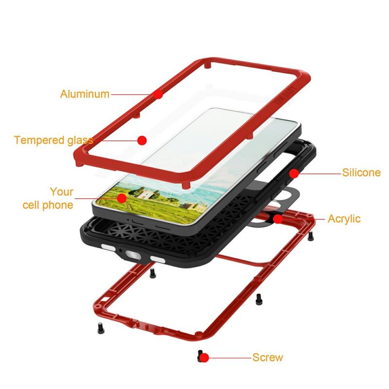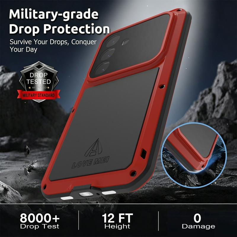 De Love Mei serie is geïnspireerd door militaire en industriële techniek, waarbij gebruik wordt gemaakt van meerlaagse bescherming met metalen frames en siliconen demping - een structuur die bestand is tegen vallen van meer dan 2 meter met behoud van touchscreen gevoeligheid.