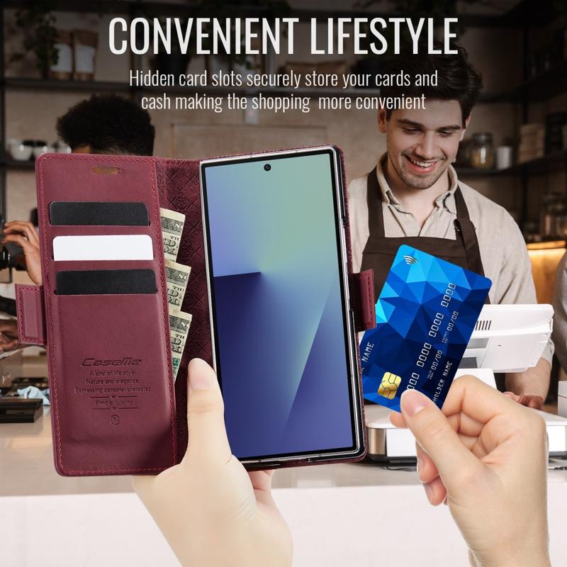De CASEME 033 Series Wallet Case voor Samsung Galaxy Z Fold7 is gemaakt van kalf textuur polyurethaan gecombineerd met TPU, en biedt full-body bescherming tegen krassen, stoten en dagelijks gebruik met behoud van een premium, elegante look.