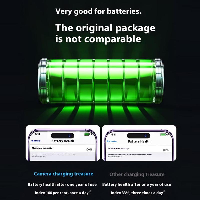 - Uniek ontwerp: Het cameravormige ontwerp onderscheidt hem van standaard powerbanks.
