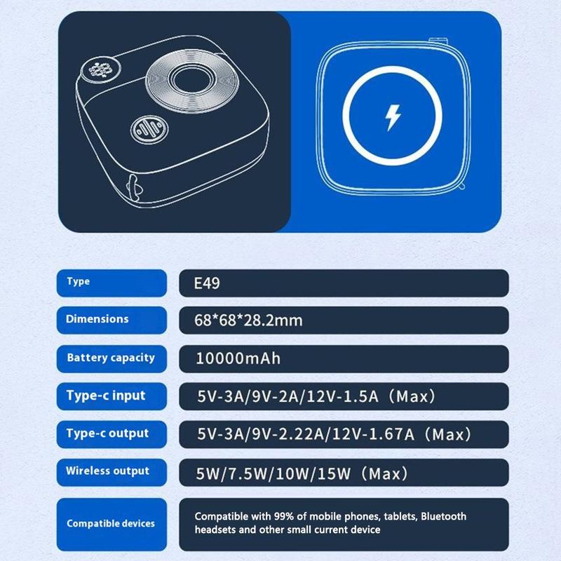 De E49 Power Bank is een stijlvol en functioneel accessoire ontworpen om je apparaten onderweg opgeladen te houden. Met zijn unieke cameravorm ziet deze powerbank er niet alleen modieus uit, maar heeft hij ook een krachtige punch met zijn 10000mAh capaciteit. Het ondersteunt snel bedraad en draadloos opladen, waardoor het een veelzijdig en handig hulpmiddel is voor reizen, vakanties en dagelijks gebruik.
