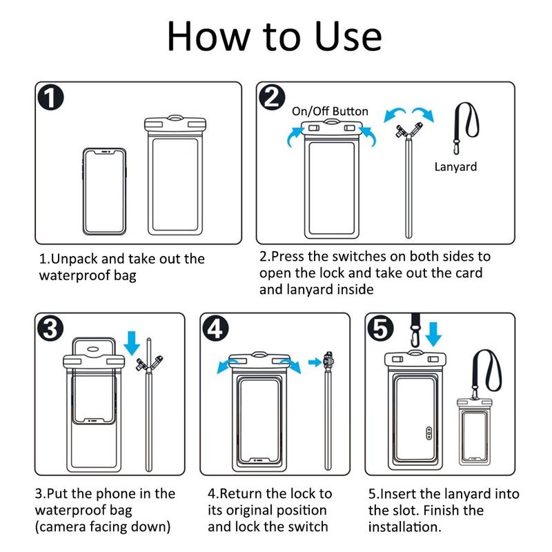 IPX8 waterdicht, onderdompelbaar tot 30 meter diep gedurende 0,5 uur, perfect voor zwembaden, stranden, vissen, zwemmen, zeilen, skiën, varen, kajakken, snorkelen, tubing, raften, douchen, sauna en andere waterparkactiviteiten, houdt je telefoon en portemonnee perfect droog en veilig