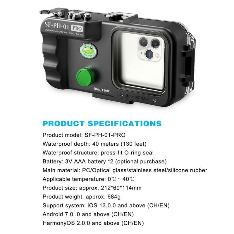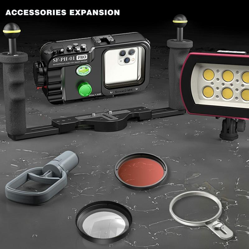 Neem je smartphone 40m mee onder water en leg levendige, vervormingsvrije herinneringen vast. De Sea Frogs SF-PH-01-PRO biedt 360° rondom bescherming dankzij een robuuste PC-behuizing, roestvrijstalen hardware en een O-ringafdichting die water, zand en stof buiten houdt. Een groot 67 mm lensvenster, krasbestendig HD-achterscherm en snelmontagepunten voor vullampen of lamparmen maken van je alledaagse telefoon een actiecamera op pro-niveau.