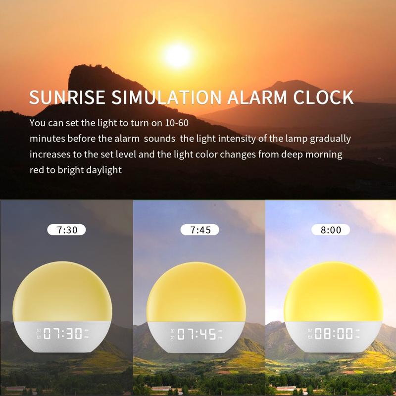 - Wekker met zonsopgang die geleidelijk in helderheid toeneemt voor een zachtere start van de dag
