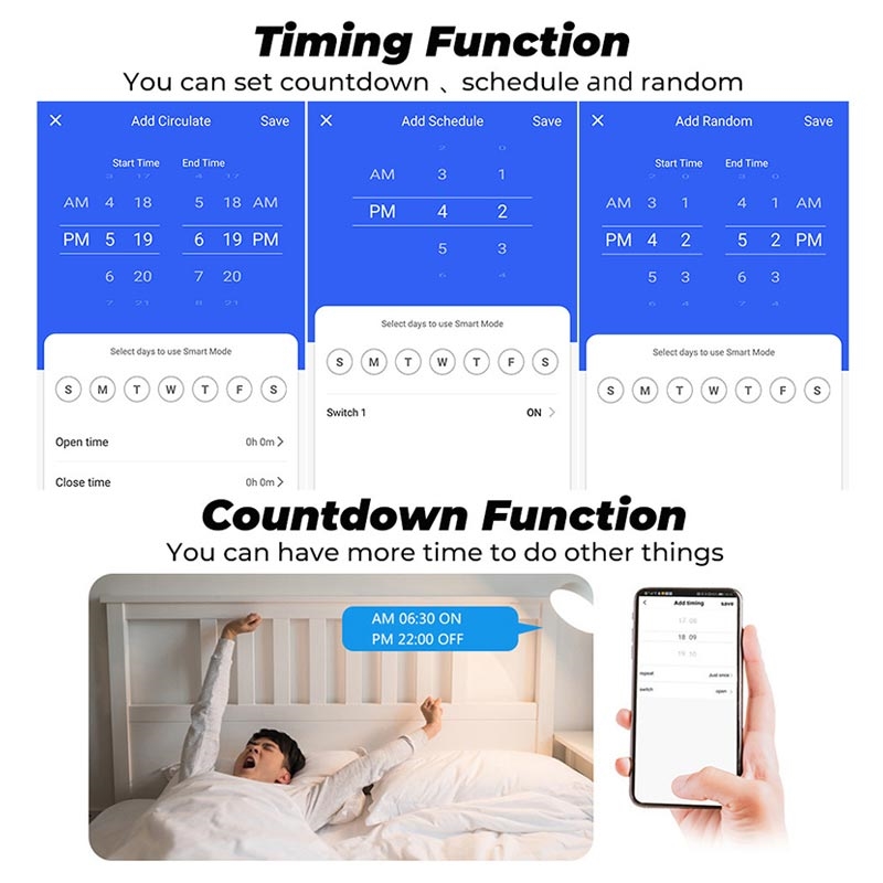Bedien uw apparaten moeiteloos via de Tuya Smart- of Smart Life-app, zelfs als u niet thuis bent. Gebruik Amazon Alexa, Google Home of Tmall Genie om apparaten aan of uit te zetten met eenvoudige spraakopdrachten. De stekker ondersteunt ook een draadloze schakelaar en afstandsbediening, waardoor hij perfect werkt, zelfs als uw wifi tijdelijk is uitgeschakeld.