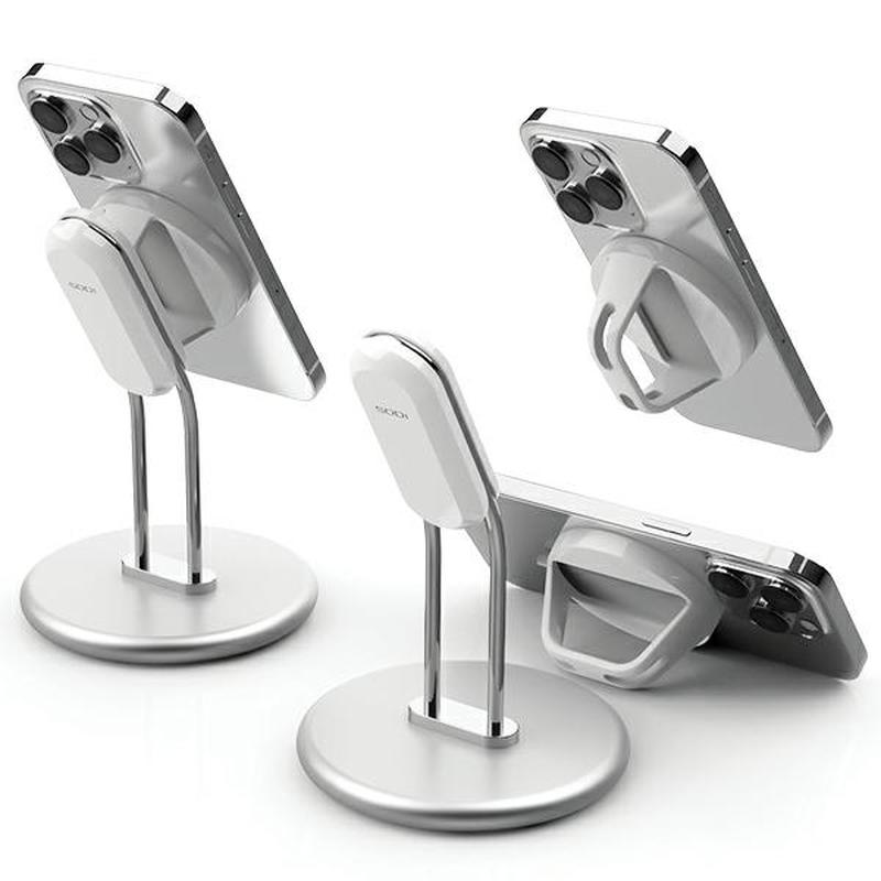 De SODI SIM300 magnetische telefoonstandaard heeft een uniek ontwerp geïnspireerd op architectonische esthetiek en biedt zowel functionaliteit als stijl. Hij is gemaakt van een hoogwaardige aluminiumlegering en zachte siliconen kussentjes en biedt een stabiele en krasvrije ondersteuning voor je telefoon. De magnetische houder van de standaard is afneembaar, zodat je hem apart kunt gebruiken of kunt vervangen door een iPhone MagSafe draadloze oplader (niet inbegrepen).