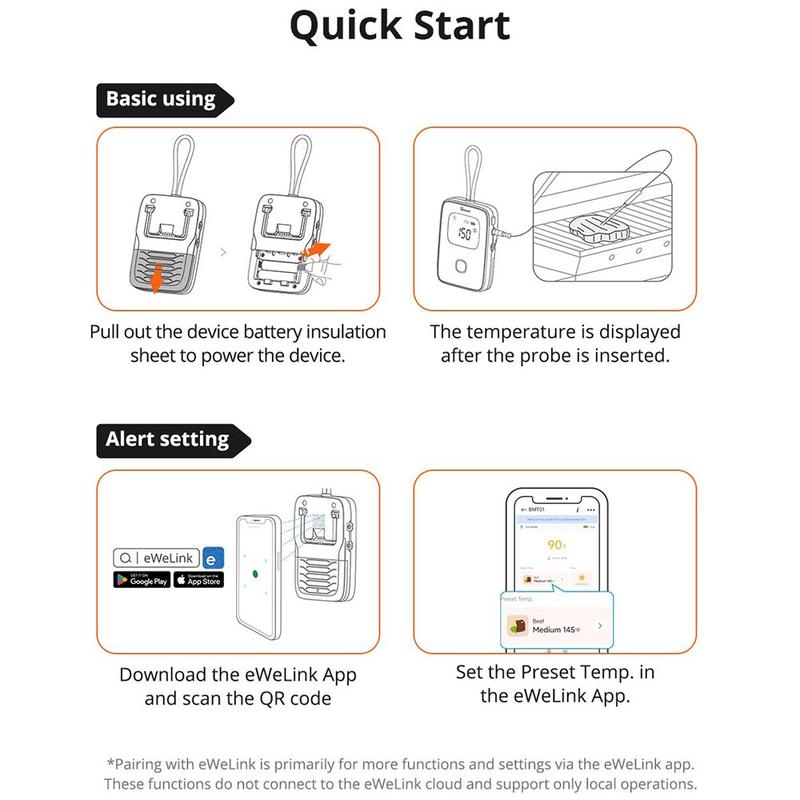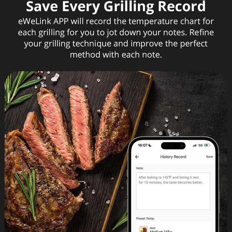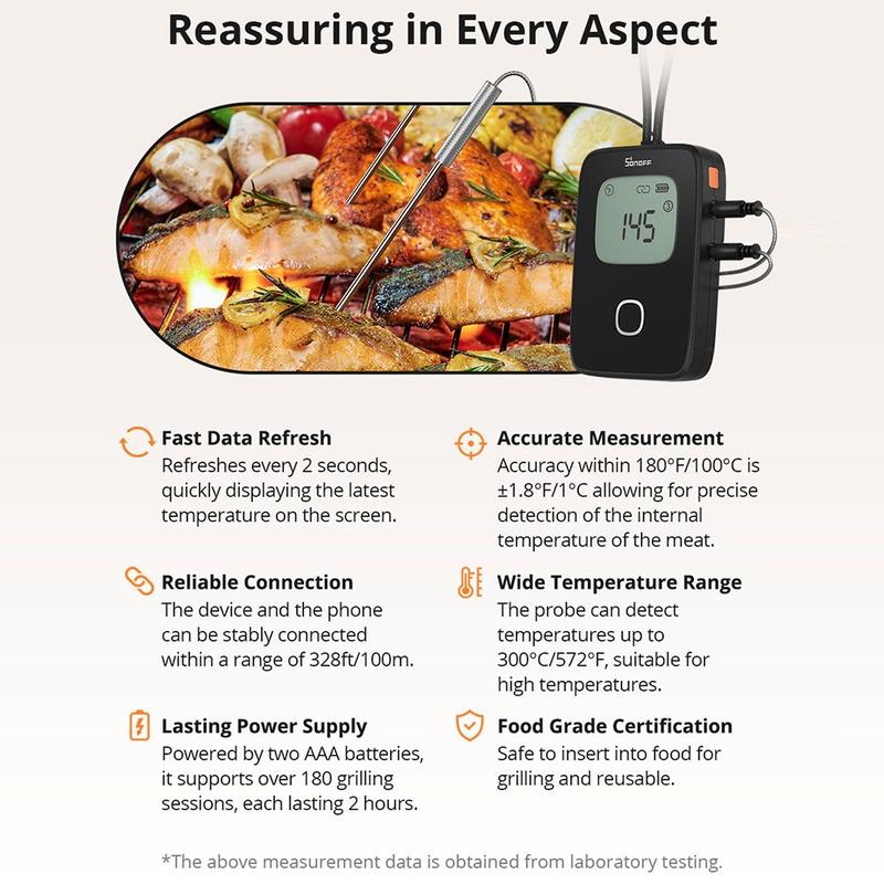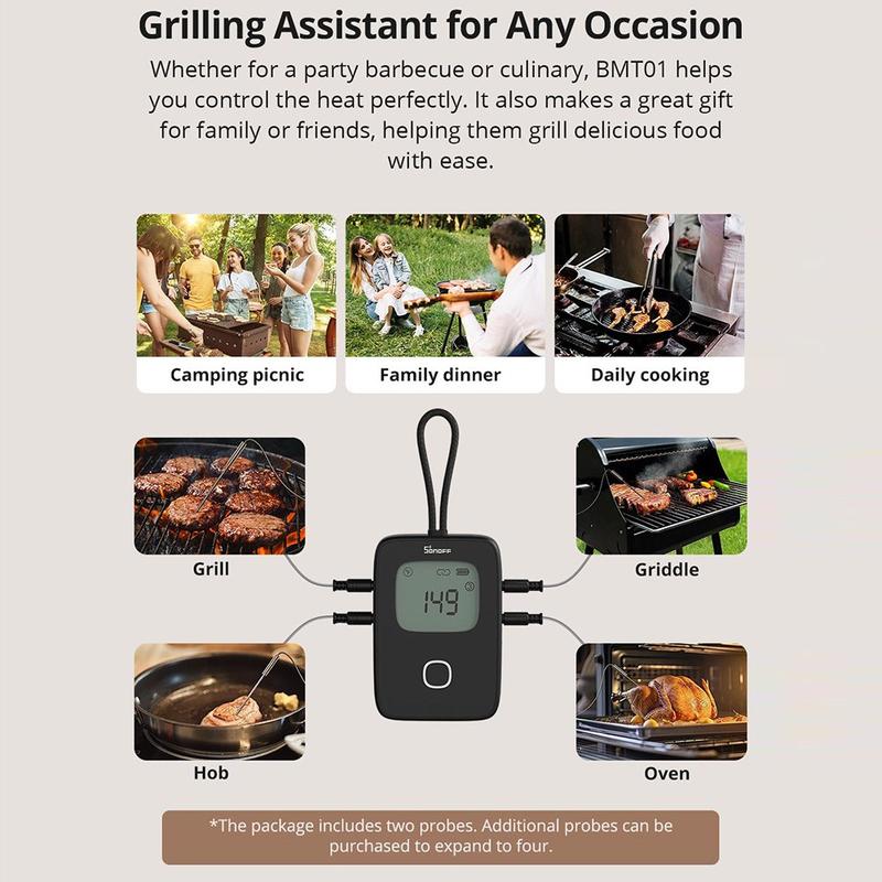 De SONOFF BMT01 vleesthermometer vereenvoudigt het bereiden van maaltijden met uiterst nauwkeurige temperatuurcontrole en gebruiksvriendelijke app-integratie. Dankzij de robuuste sonde en het lange snoer kun je zelfs de grootste stukken vlees nauwkeurig meten zonder in de knoop te raken met snoeren in de buurt van open vuur. De controle- en waarschuwingsfuncties van de eWeLink app helpen giswerk te voorkomen, waardoor je tijd bespaart en het risico op te gare of te gare maaltijden vermindert.