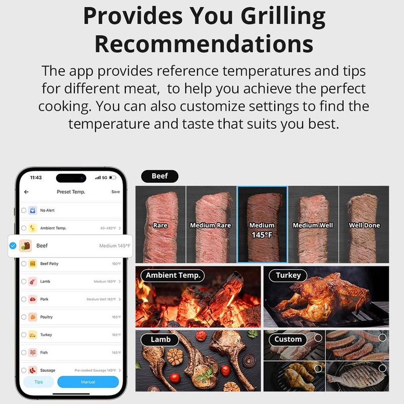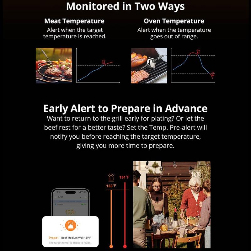 - Slimme Bluetooth-monitoring: Blijf op de hoogte van de kerntemperatuur van je eten via een betrouwbare Bluetooth-verbinding met je smartphone - perfect voor multitasking in de keuken of voor het ontvangen van gasten.