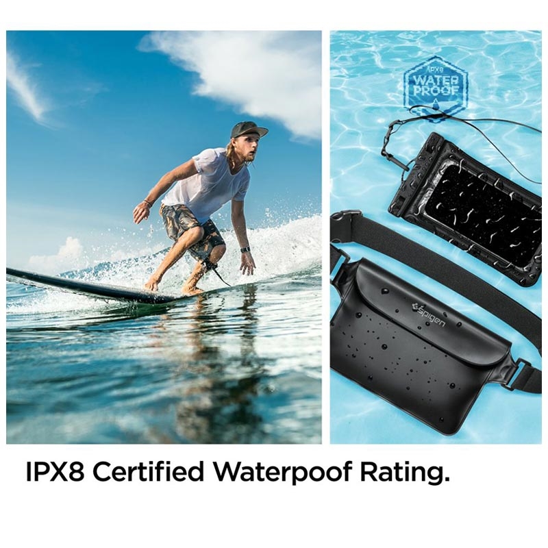 Deze waterdichte Spigen A621-set bevat een unisex waterdichte heuptas met een verstelbare riem en een waterdichte drijvende hoes voor smartphones tot 6,9". De smartphonehoes die in de set zit, heeft een zwevend ontwerp, zodat je hem gemakkelijk kunt vinden als je hem kwijt bent.Hij is ook transparant aan de voor- en achterkant, zodat je onderwaterfoto's kunt maken.