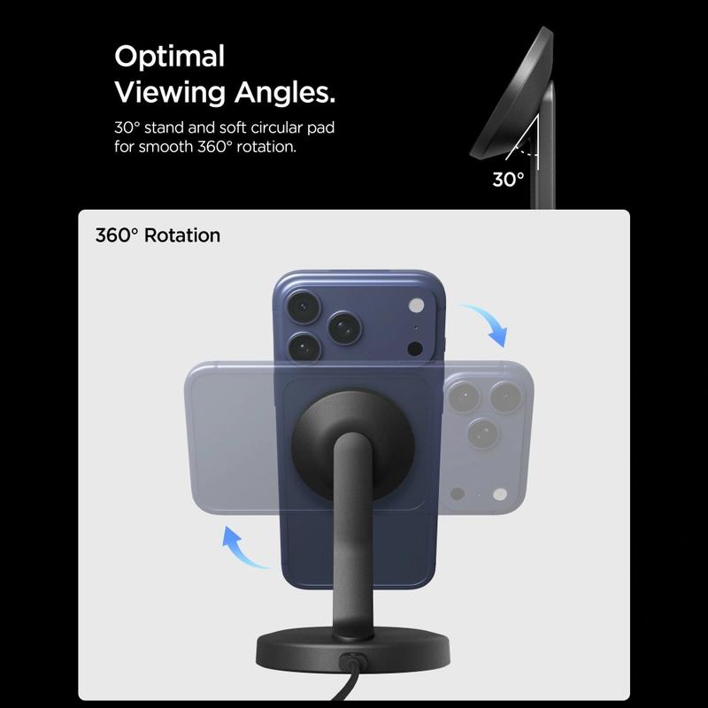 De Spigen EF151MS combineert een sterke magnetische uitlijning, een comfortabele kijkhoek en stabiel draadloos opladen in één compact apparaat. Hiermee kunt u uw telefoon tegelijkertijd opladen en gebruiken zonder hem vast te houden, wat hem praktisch maakt voor zowel werk als ontspanning. Met ingebouwde veiligheidsvoorzieningen en een duurzame USB-C-kabel biedt hij betrouwbaar opladen in een strak, modern ontwerp.