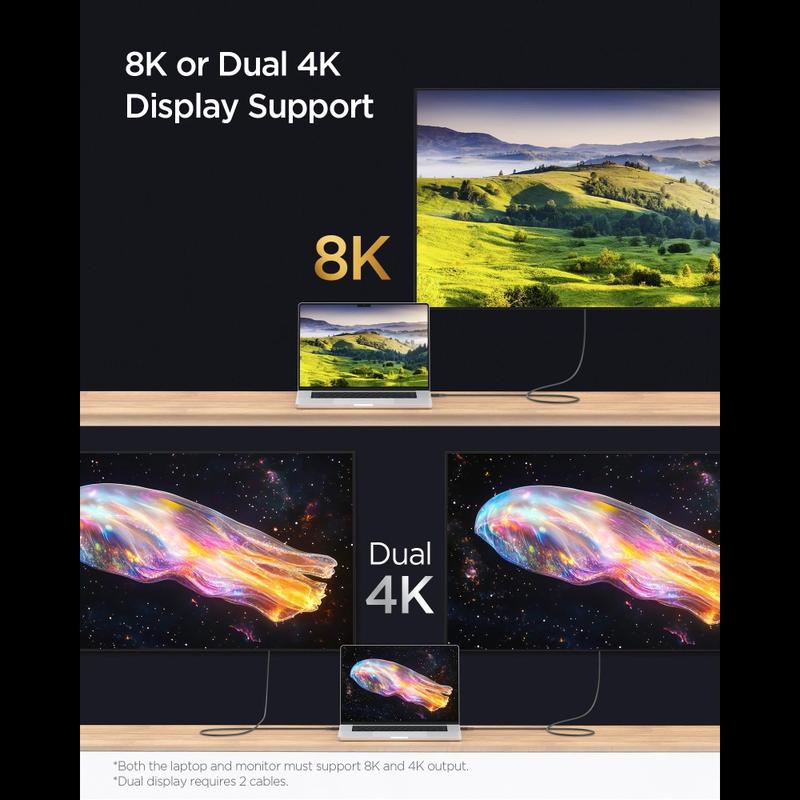 Dankzij de compatibiliteit met Thunderbolt 3 en 4, ondersteunt de kabel ook geavanceerde video-uitvoer-8K (enkel scherm) en 4K (dubbele schermen) via DisplayPort 2.0. Hierdoor is de kabel perfect voor het aansluiten van laptops of dockingstations op monitoren met een hoge resolutie.