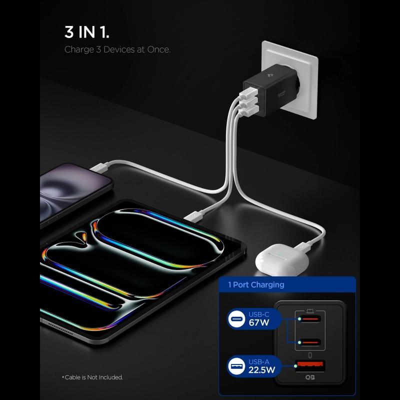 Spigen Essential EE673EU 3-poorts wandoplader - 67W GaN Pro snelle oplader met Dual USB-C & USB-A