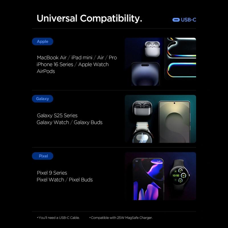 De Spigen EE673EU is de perfecte alles-in-één oplaadoplossing voor gebruikers met meerdere apparaten. Met een sterke stroomtoevoer, intelligent energiebeheer en robuuste veiligheidsfuncties zorgt hij voor betrouwbaar snel opladen, waar u ook bent. Compact, efficiënt en gebouwd met de vertrouwde kwaliteit van Spigen, is het een uitstekende keuze voor reizen, werk en dagelijks gebruik.