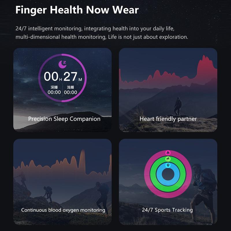 - Uitgebreide gezondheidstracking - Houdt hartslag (Tianyi 3602 sensor), zuurstof in het bloed (SpO2) en slaappatronen bij.