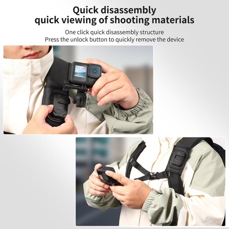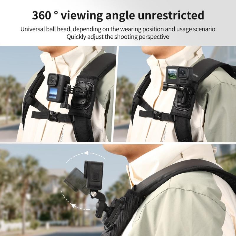 De houder is ook voorzien van een universele kogelkop voor flexibele hoekaanpassing, waardoor het gemakkelijker wordt om je camera te positioneren voor POV-opnames of opnames vanuit een zijdelingse hoek, afhankelijk van hoe je je rugzak draagt. Met zijn lichtgewicht ontwerp, duurzame nylon- en vezelconstructie en snelontgrendelingsfunctie is het een handig accessoire voor creators en outdoorgebruikers die gemakkelijker mobiel willen filmen.