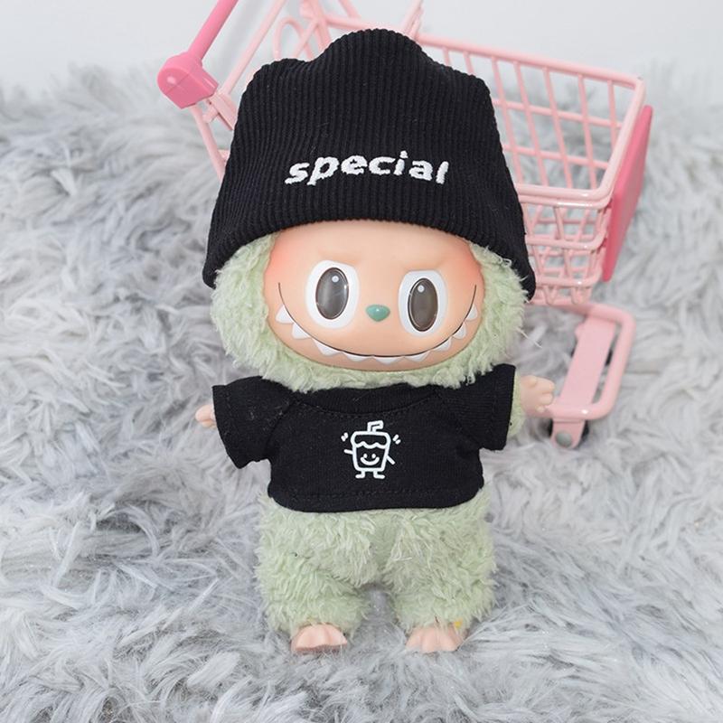 Street Style kleding voor Labubu pop 17cm - gebreide muts & grafisch T-shirt kostuum