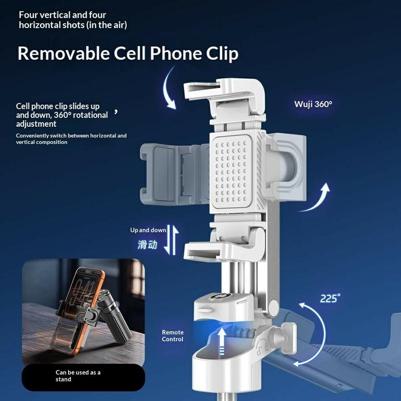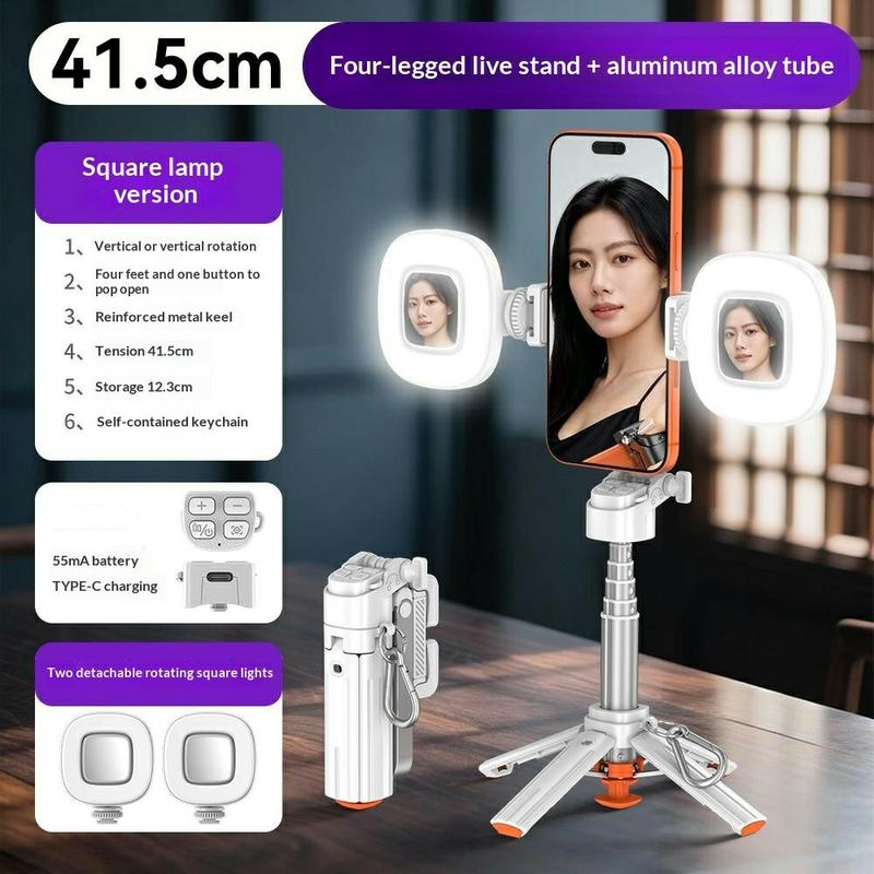 De automatisch uitklapbare statiefpoten zorgen voor snelle stabiliteit wanneer het statief wordt neergezet, terwijl het uitschuifbare ontwerp en de draaibare telefoonhouder het gemakkelijk maken om te wisselen tussen verschillende opnamehoeken en formaten. Met de meegeleverde Bluetooth-afstandsbediening kunt u handsfree foto's maken, en de dubbele vierkante invullampen zorgen voor extra helderheid bij selfies, videogesprekken en opnames.