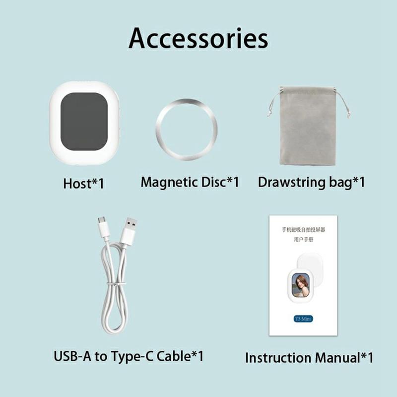 De T3 Mini is een draadloos apparaat voor het spiegelen van je telefoonscherm: een compact en praktisch accessoire dat is ontworpen om selfies, vloggen, het maken van content en het fotograferen met de camera aan de achterzijde eenvoudiger te maken. Met directe magnetische bevestiging, draadloze schermspiegeling en een helder 2,01-inch IPS-scherm helpt het u om in realtime een voorbeeld te bekijken van de achtercamera van uw telefoon zonder ingewikkelde installatie. Dankzij het lichtgewicht ontwerp is het gemakkelijk overal mee naartoe te nemen, waardoor het een handig hulpmiddel is voor dagelijkse foto's, korte video's, livestreams en reiscontent.