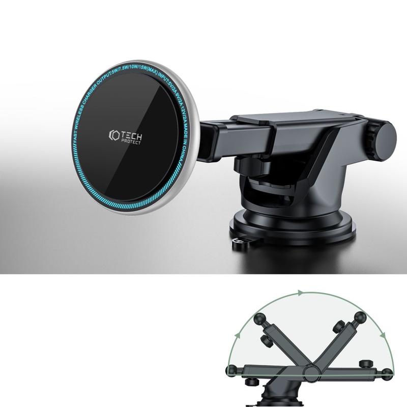 Designer Tech-Protect A2 autohouder voor dashboardmontage, uitgerust met de mogelijkheid om Apple apparaten op te laden met MagSafe technologie met een maximaal vermogen van 15W. Uitgerust met een stevige, in lengte verstelbare arm, die in combinatie met een draaibare kop zorgt voor een perfecte pasvorm en een uitstekend gebruikscomfort. De ingebouwde sterke magneet houdt je smartphone stevig vast, zelfs in de moeilijkste omstandigheden. Bovendien kun je met het accessoire de telefoon zowel verticaal als horizontaal gebruiken, zodat je het apparaat individueel aan je behoeften kunt aanpassen. De hoogwaardige ABS, zinklegering en PC-componenten garanderen langdurig gebruik. De installatie is uiterst eenvoudig, ontvet gewoon de plek waar je de hendel wilt vastplakken, draai de hendel vast en klaar is kees! Om de kleverige eigenschappen van de zuignap te behouden, moet je hem wassen onder stromend water voor je hem opnieuw installeert.
