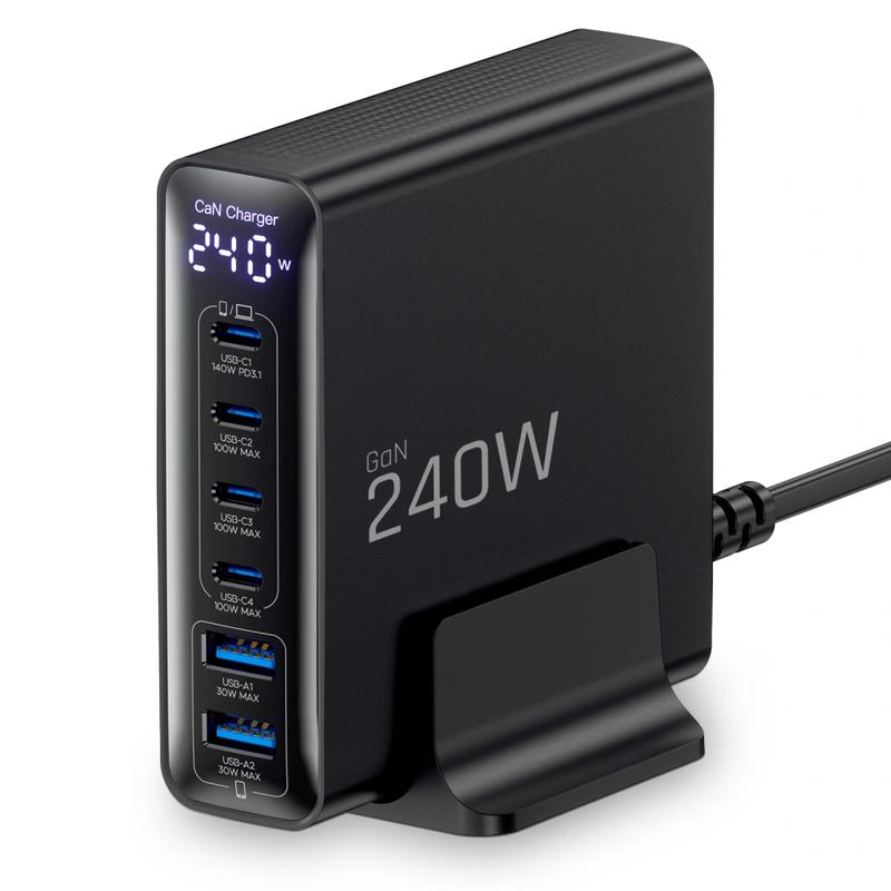 De USB-C1-poort levert tot 140 W, terwijl de andere USB-C-poorten elk tot 100 W ondersteunen, waardoor u zelfs krachtige laptops snel kunt opladen. Hij ondersteunt ook PD 3.1, QC 3.0 en Samsung Super Fast Charging 2.0. Een ingebouwd LED-display toont het huidige vermogensniveau en de stabiele U-vormige voet houdt de lader rechtop op uw bureau.