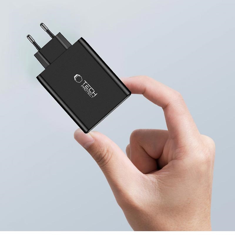 The Tech-Protect NC100W-GAN 4-port network charger is a contemporary wall charger for efficient simultaneous charging of multiple devices. It features three USB-C ports and one USB-A port for your convenience. It delivers a power of 100W, which allows you to instantly charge most mobile devices, such as smartphones, tablets, and laptops. USB-C ports support the Power Delivery (PD) protocol, while USB-A port is compatible with Quick Charge 3.0 (QC3.0) technology.