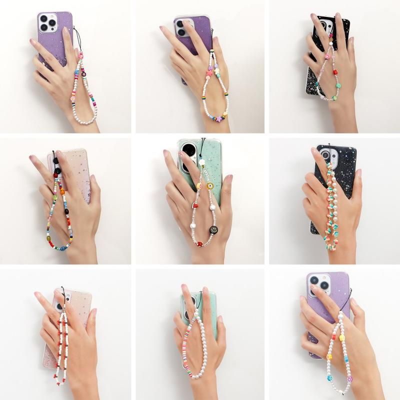 Geef je telefoon een speels en stijlvol tintje met dit 22cm lange telefoonkoord met parelkralen. Het is ontworpen als zowel decoratief sieraad als praktische polsband en combineert kunstparels met kleurrijke platte harskralen voor een frisse, op de regenboog geïnspireerde look die goed past bij verschillende telefoonhoesjes en alledaagse outfits.