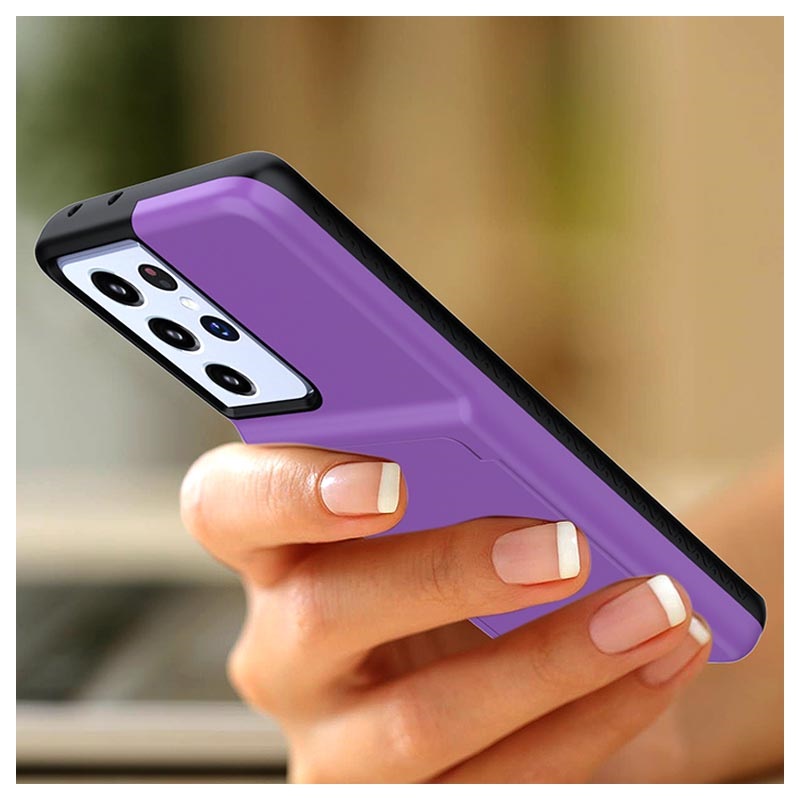 Verfris de look van je Samsung Galaxy S21 Ultra 5G met deze slanke Hybrid Case! Om er altijd perfect uit te zien, is er een gemakkelijk toegankelijke spiegel. Maak winkelen gemakkelijker met twee creditcardvakken. Versterkte randen beschermen je Samsung Galaxy S21 Ultra 5G extra.